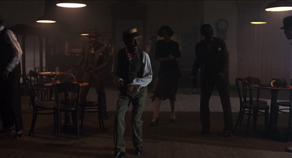 Coppola, post The Godfather Part II made films that looked like giant grandiose set pieces. The films were less about how his lens captured a moment in an honest manner and more about setting up something lavish within the frame. As a result, many scenes in The Cotton Club unfold like they might be existing on a stage. The camera, often fixed in the position of the fourth wall, has two favored frames: the straight-on wide shot and the tight close-up. One to see the grand sets and choreography. The other to observe slicked hair, researched costumes, and bone structures of the attractive actors. The director wants us to feel the decorum, something he certainly succeeds at.